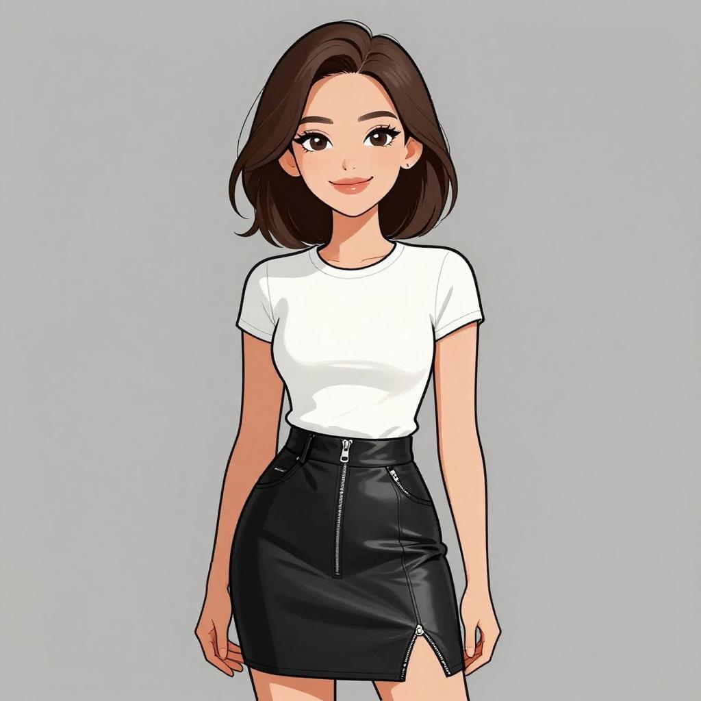 Digital anime-style illustration of a smiling woman with shoulder-length brown hair, wearing a white t-shirt and black leather skirt with a zipper. Light gray background