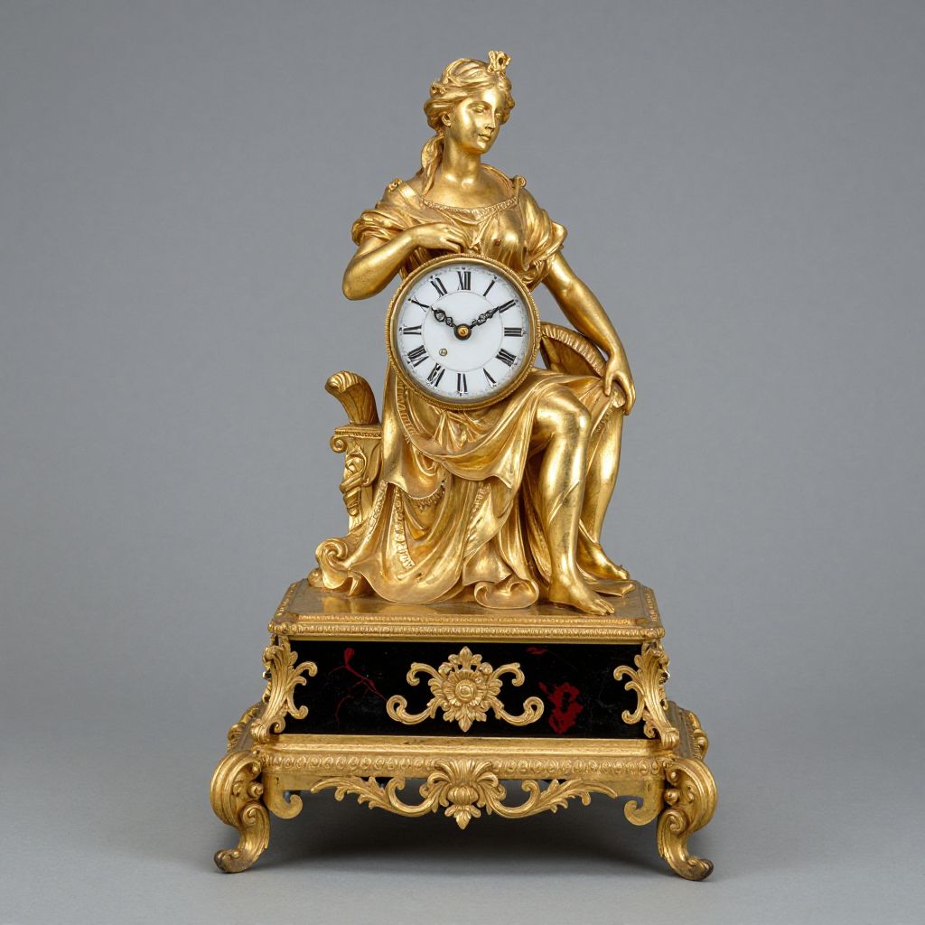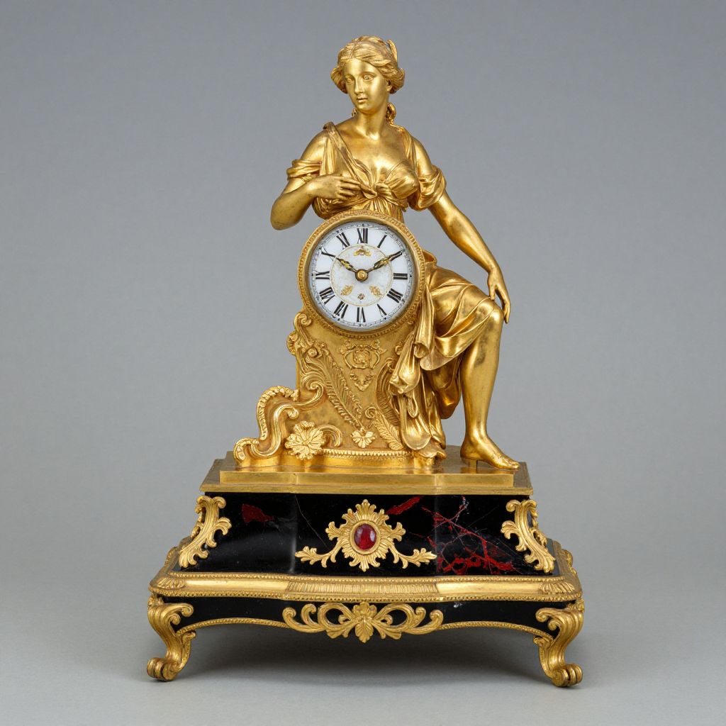 A French Neoclassical-style pedestal clock featuring a gilded bronze sculpture of a seated woman holding a circular enamel dial, set atop a black onyx base adorned with intricate gold embellishments and red veining, showcasing vintage craftsmanship and opulent detailing.