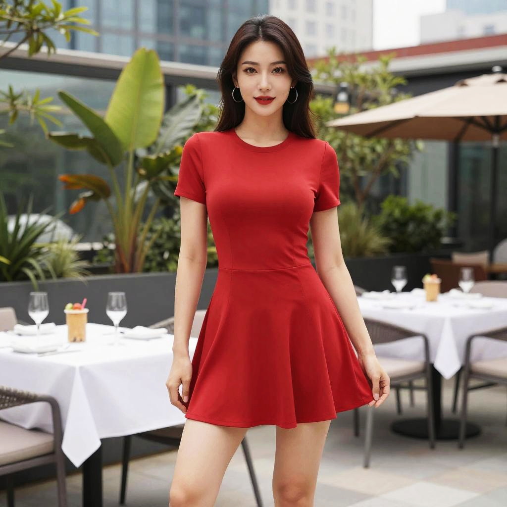 Photograph of an Asian woman with long black hair, wearing a short, fitted red dress that flares slightly at the skirt. She has fair skin, red lipstick, and is wearing hoop earrings. She stands outdoors on a patio with white tablecloths, wine glasses, and small candles on the tables. The background includes green plants, large leafy plants, and a modern building with glass windows. The patio has black wicker chairs and a beige umbrella. The lighting is bright, suggesting daytime. The overall style is modern and chic.