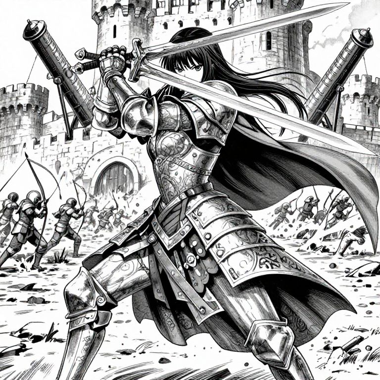 Medieval manga warrior princess wielding a double-edged sword, wearing layered armor with flowing cape, set against a backdrop of a castle siege with catapults and archers, detailed manga style with a mix of dynamic action and ornate patterns.