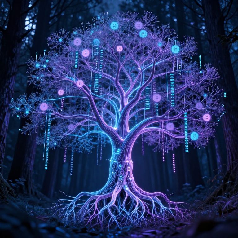 Elementtree representation, a surreal tree with roots and branches shaped like parsing algorithms, intertwined with cascading code streams and glowing symbols, high contrast cybernetic forest, ethereal blue and purple hues, digital meets nature theme