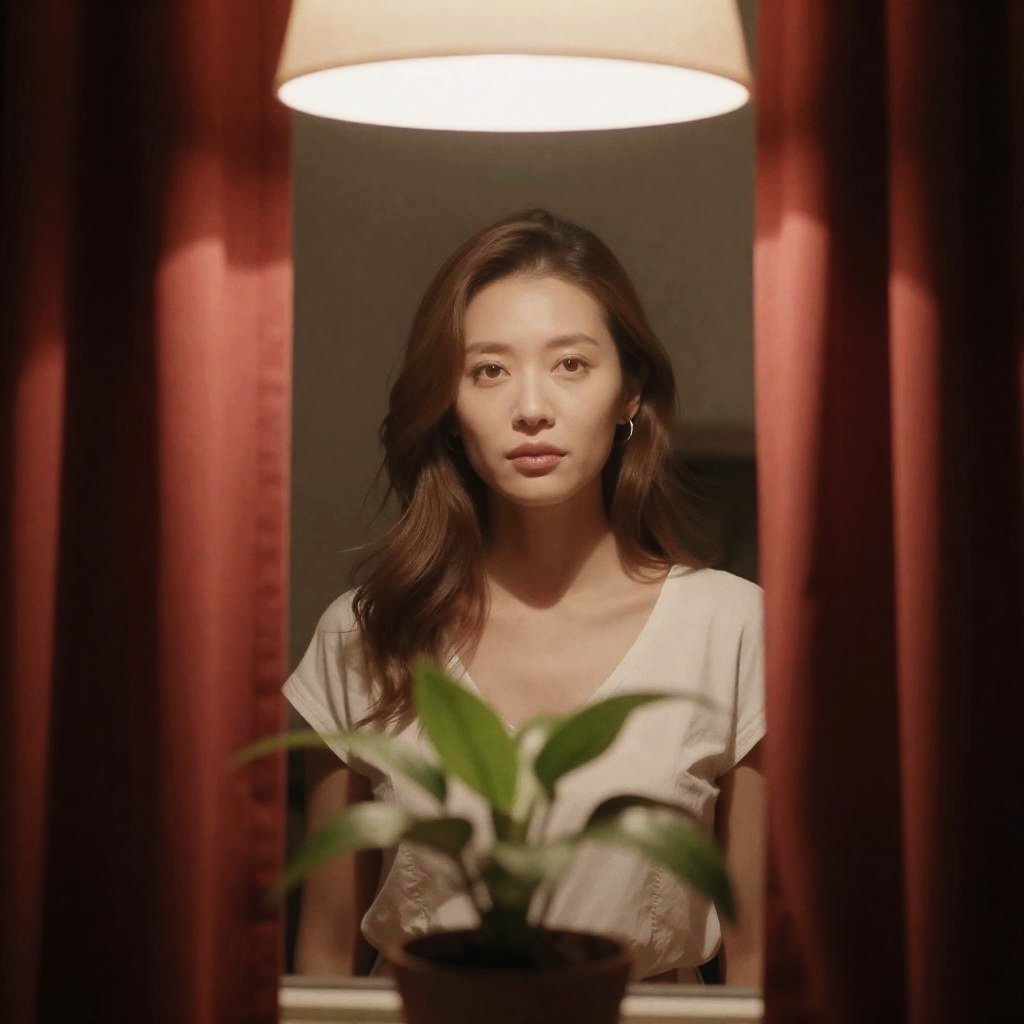 Photograph of a woman with light brown hair, wearing a white top, standing behind a window with red curtains. Soft light from a lamp above illuminates her face. Potted plant in foreground. Warm, indoor setting. Woman has neutral expression.