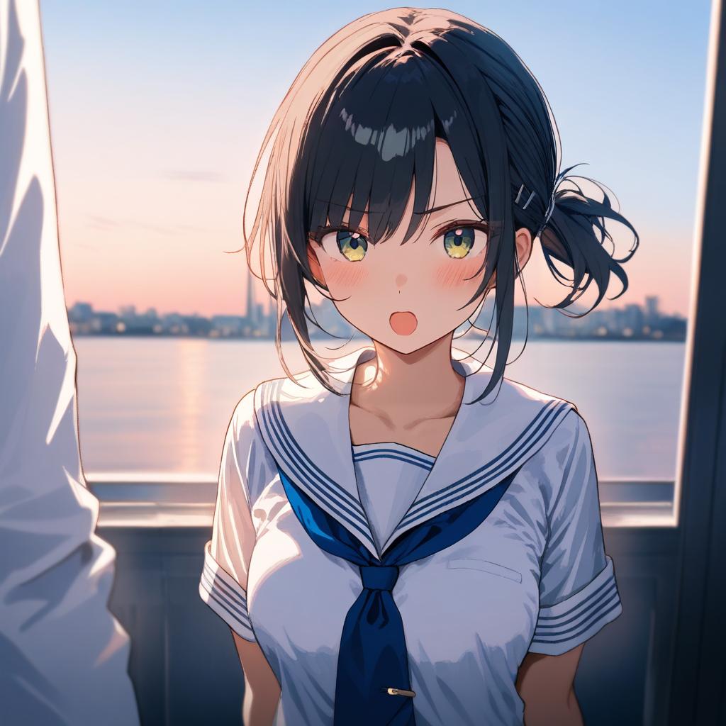 Portrait of an anime-style girl with long black hair and glasses, wearing a traditional Japanese sailor school uniform with a navy blue skirt and white top, accented by a red neckerchief. She stands indoors with soft sunlight illuminating her, and framed pictures of a ship and a mountainous seascape hanging on the wall behind her.