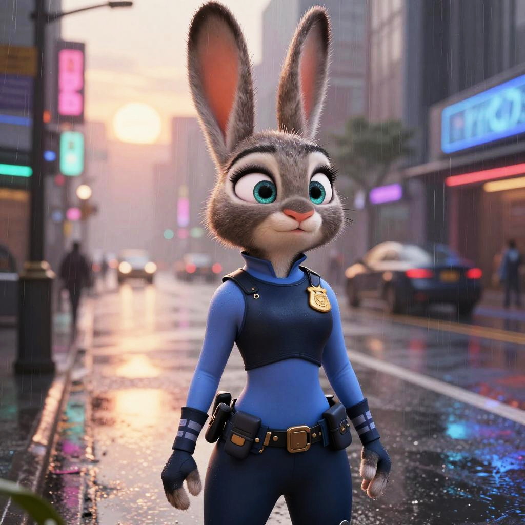 Uploaded on e621, (by Whooo-Ya, by Sskomu \(artist\), by Kakure Eria), solo female (((rabbit Judy Hopps) grey body, wet fur, clear green eyes)), (wear police uniform, jacket, pants, belt:1.3), (small breasts), ((detailed fluffy fur)), (looking at viewer, three-quarter portrait, three-quarter view), , ((standing at city street on sunset raining day)), (rain, fog, mist, cyberpunk, neon light), (detailed background, depth of field, half body shadow, sunlight, ambient light on the body), (masterpiece, best quality, ultra realistic, 4k, 2k, (high detail:1.3), (3d \(artwork\):1.2), blender \(software\), (soft focus:1.2), ray tracing, (unreal engine:1.3), absurd res)