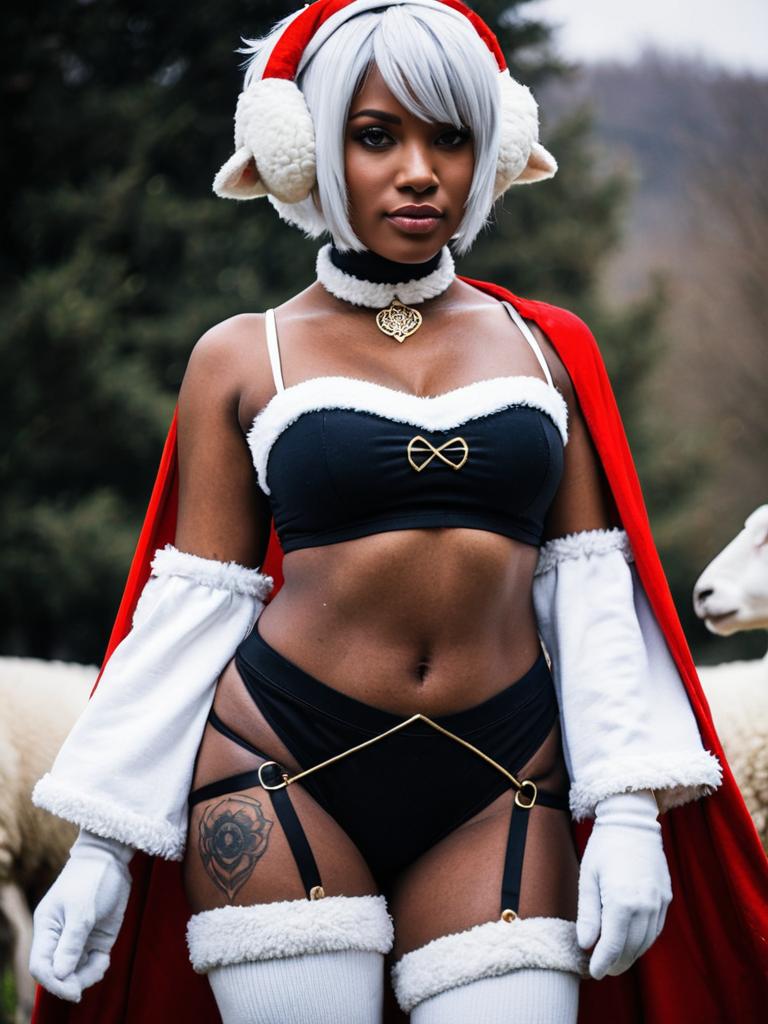 Photo-realistic cosplay photo of person in altera the santa (fate) costume. 1girl, dark-skinned female, red eyes, short hair, white hair, small breasts, thighs, navel, full-body tattoo, collarbone, veil, bare shoulders, detached sleeves, choker, sheep, earmuffs, mittens, white mittenslifestyle stock photo, shallow depth of field, lifestyle stock photography, shallow depth of field, natural lighting, warm tones, soft background blur, candid moments, vibrant colors, realistic textures, modern casual clothing. full body shot
