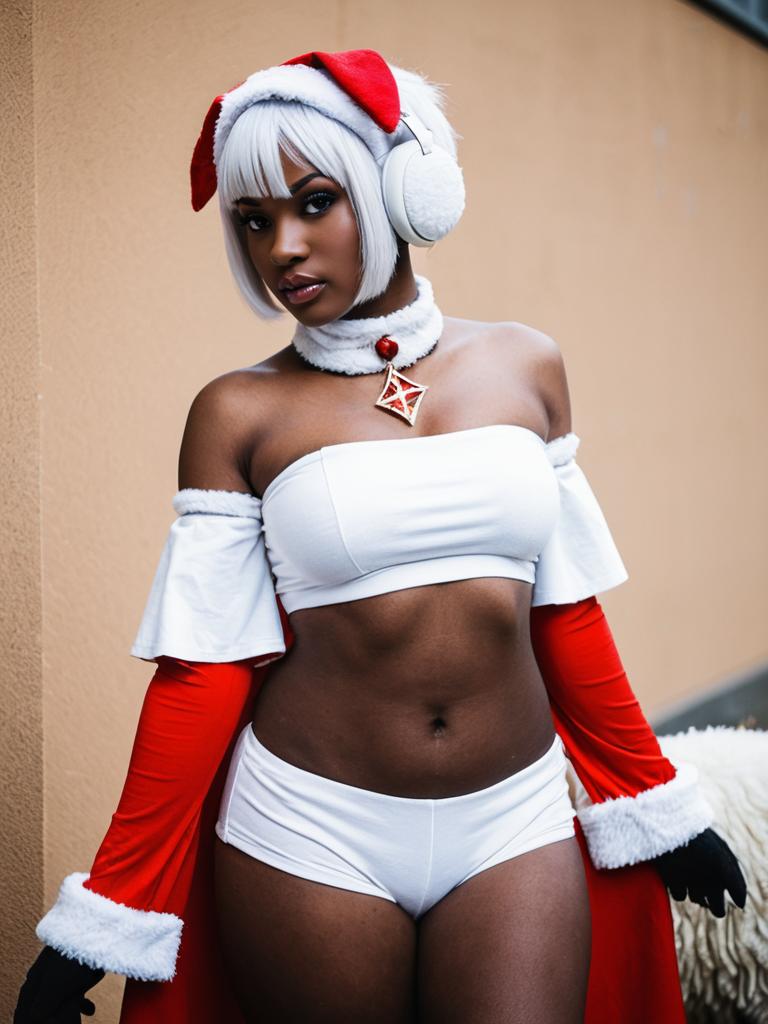 Photo-realistic image of a dark-skinned female cosplayer dressed as Altera the Santa from Fate series. She wears a white off-shoulder crop top with detached white sleeves, red arm sleeves with white faux fur cuffs, white shorts, a white choker with a red jewel, white earmuffs, a cosmetic white wig with a red Santa hat detail, and black gloves. The photo captures her from the waist up with a shallow depth of field and a plain background, highlighting vibrant colors and realistic textures.