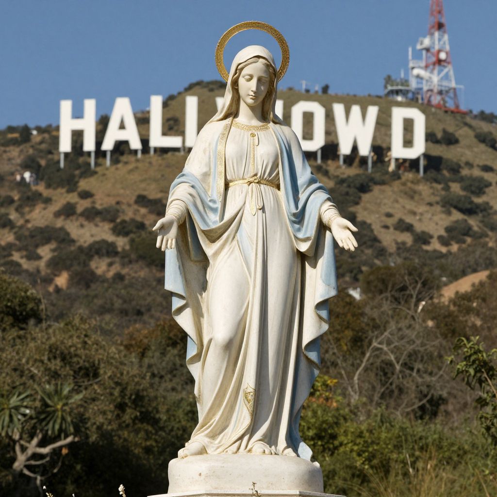 Environment Map a statue of the blessed mother of jesus half statue half human on the hills of hollywood by Annie Leibovitz,