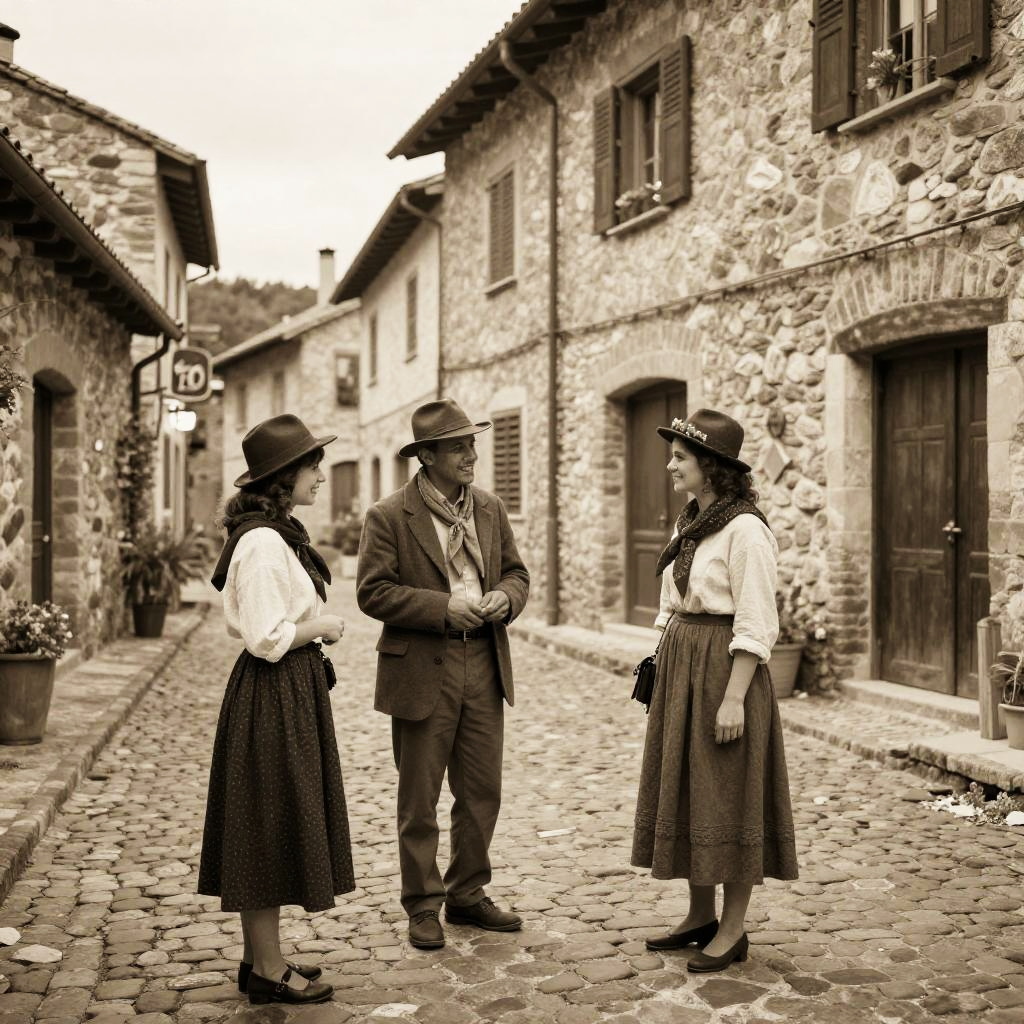 Regazze exploring an ancient European village, cobblestone streets and rustic buildings, vintage outfits with scarves and hats, warm sepia-toned filter, candid moments of friendship and discovery, evoking nostalgia and charm.