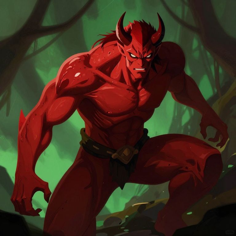 Digital illustration of a muscular, red-skinned demon with horns, glowing eyes, and black loincloth, crouching in a dark, green