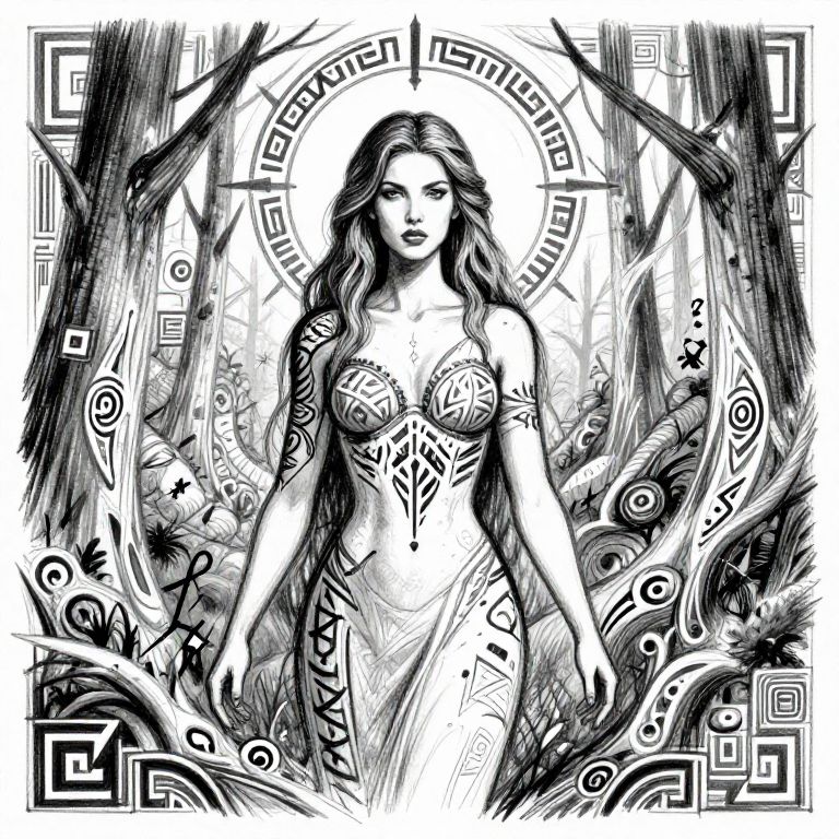 Donnie Brasco forest goddess surrounded by cyber sigil tribal designs , sketchy, black and white , hand drawn,