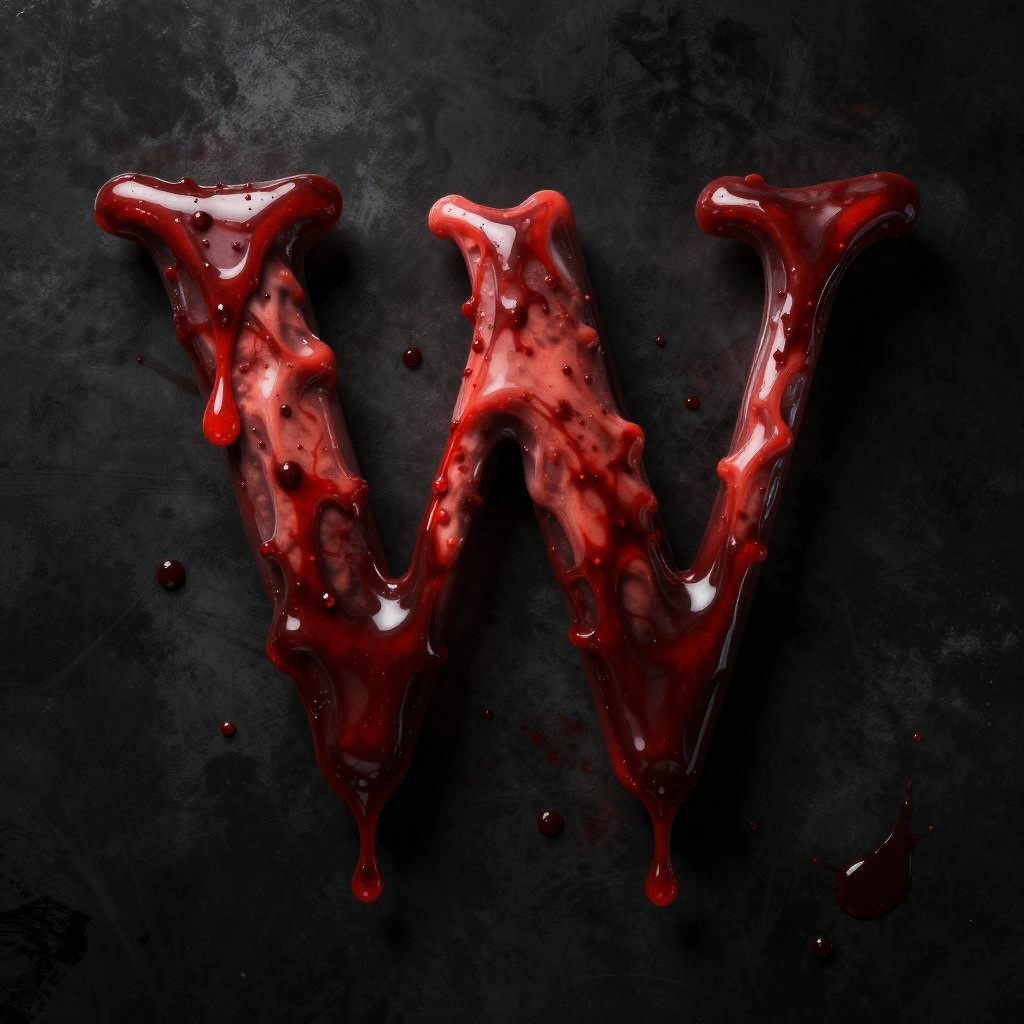 Drippy blood font with thick, viscous red letters resembling slowly oozing blood, horror and thriller aesthetic, detailed wet and shiny wetness effects, black grunge background with faint light reflections enhancing the 3D texture of the blood