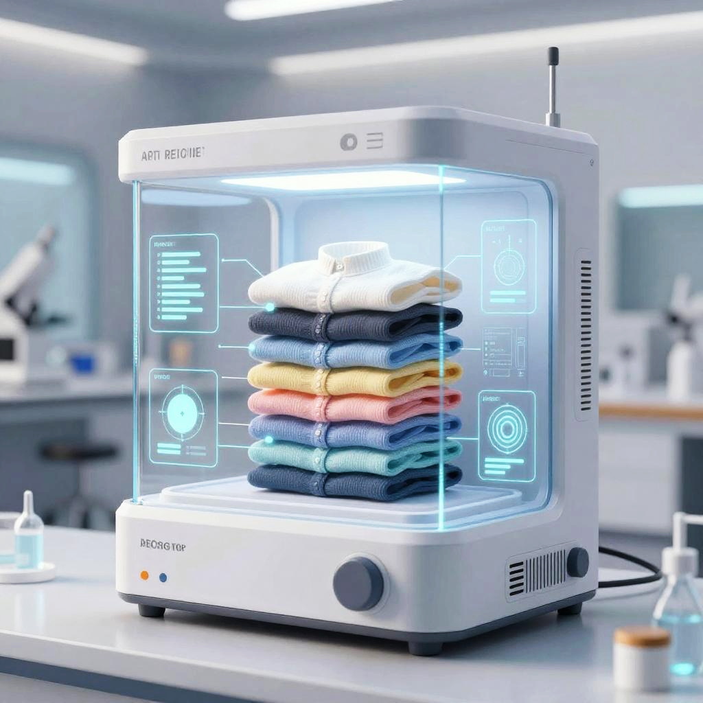 AI cloth remover free tool visualized as a high-tech device in a futuristic lab, showing AI algorithms interacting with garment layers on a 3D model, glowing UI elements, modern minimalistic design, soft ambient lighting, tech innovation theme