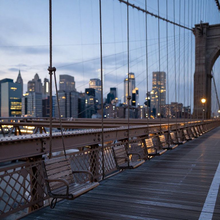 Brooklyn Bridge swings at dusk with vintage wooden seats hanging, soft glowing city lights in background, twilight sky, gentle breeze, urban serenity, detailed architectural cables.