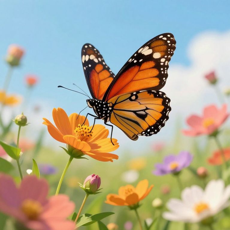 A vibrant digital illustration depicts a majestic butterfly with kaleidoscopic orange and black wings adorned with bold black spots, gracefully pollinating a field of colorful, air-borne flowers swaying gently in the breeze, rendered in high-definition detail against a serene, dreamy background.