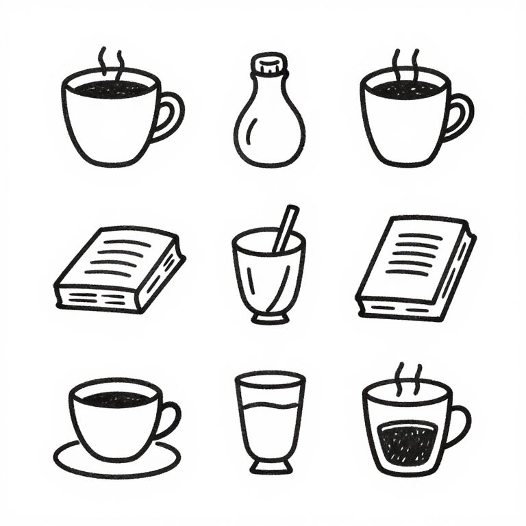 Minimalist sketch clipart of everyday objects like coffee cups, books, and glasses, rendered in quick, expressive lines with a casual doodle style, suitable for creative planners and stationery designs.