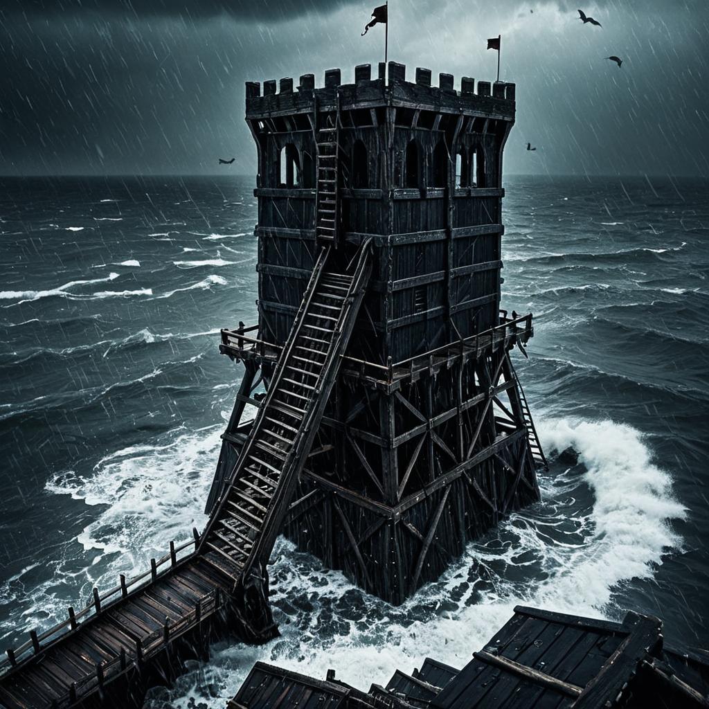 Bird's eye view of a medieval galleon on stormy sea, eerie atmosphere, grimy mood, raining, storm, detailed and intricate cannons, rainy weather, high quality, dark fantasy, atmospheric lighting, realistic water