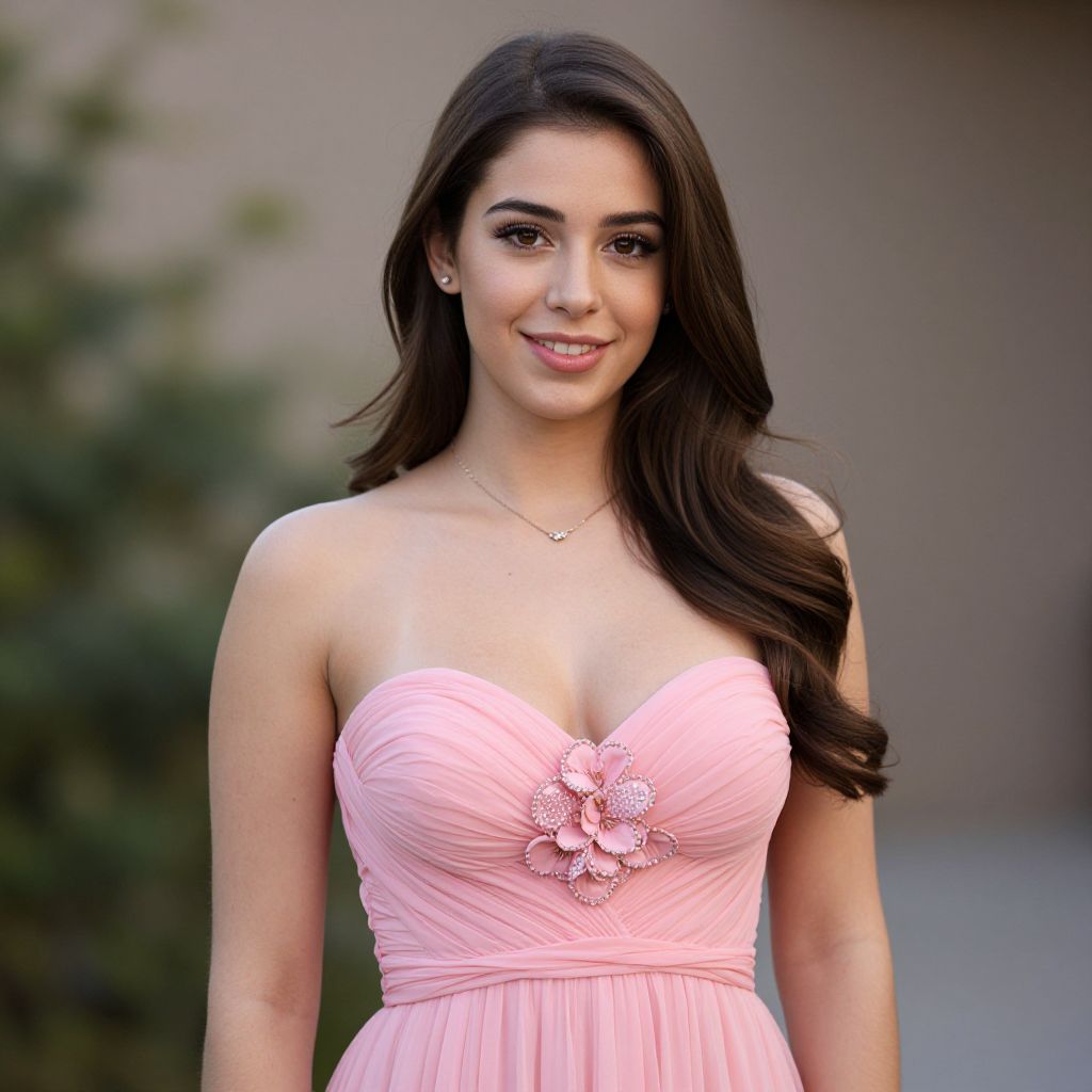 Pretty pink prom outfit, 1girl, solo, dress, pink dress, brown hair, long hair, breasts, flower, cleavage, brown eyes, blurry, blurry background, strapless, smile, looking at viewer, bare shoulders, strapless dress, outdoors