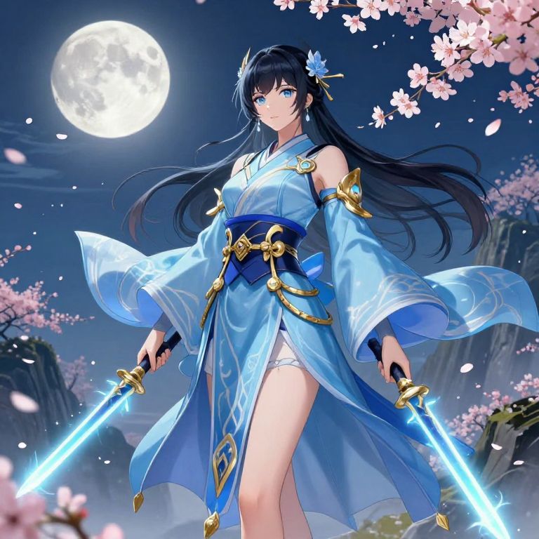 Anime-style illustration of a blue-haired woman in a flowing white and blue kimono, holding glowing blue swords, under a full moon amidst cherry blossoms