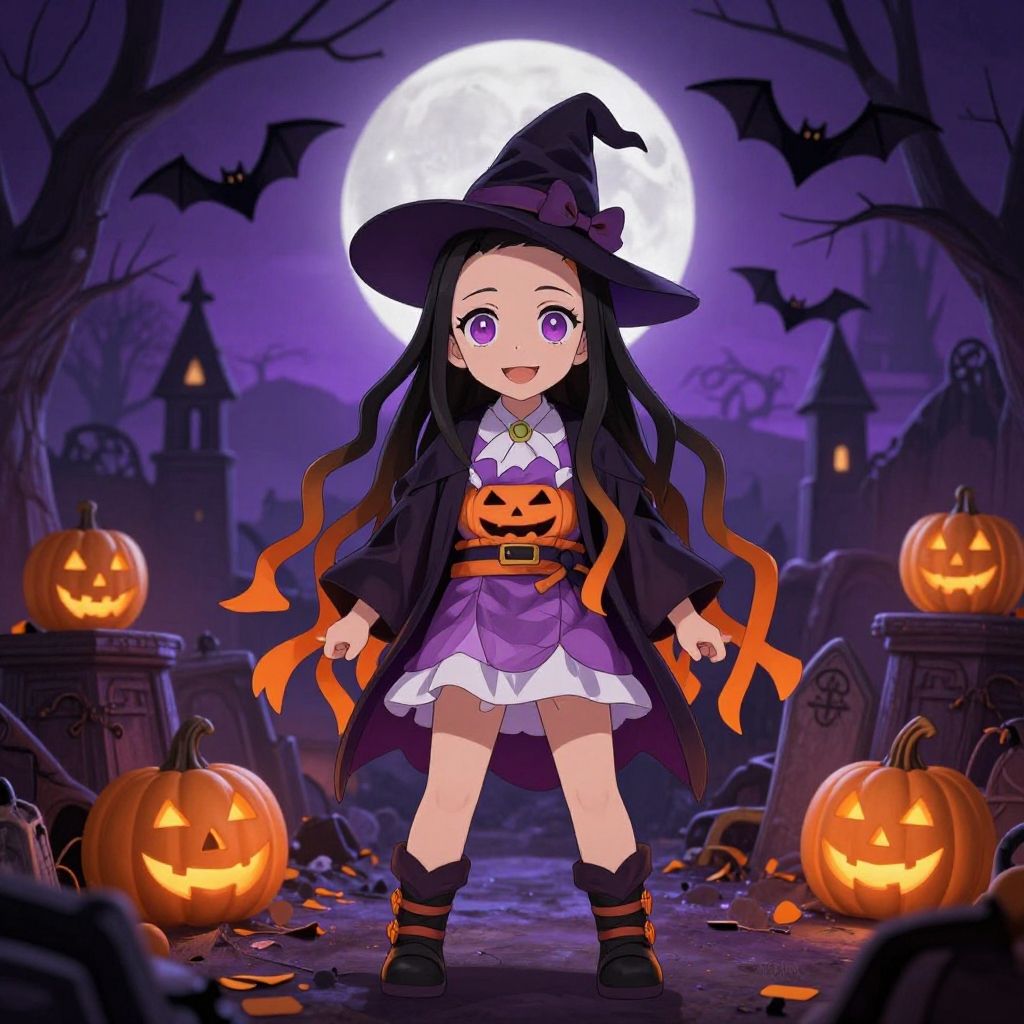 Nezuko Halloween wallpaper showing Nezuko in a cute witch costume, standing in a haunted graveyard with flickering lanterns and twisted trees, vibrant purple and orange colors, bats flying across a full moon sky, atmospheric lighting in high detail anime art.