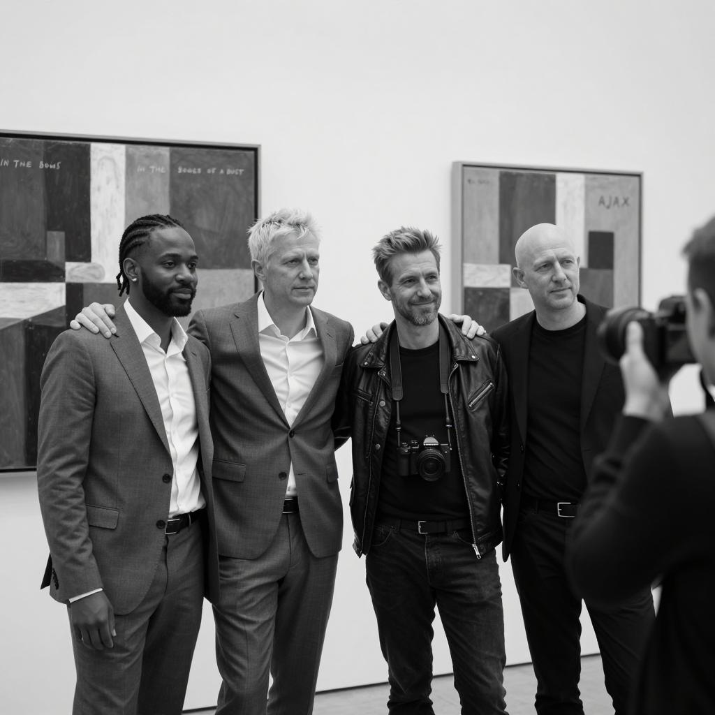 Three men in suits sitting closely together. The man on the left has light hair, serious expression, and dark suit. The center man, bald with glasses, slightly smiling, wearing a dark suit with a patterned tie. The man on the right has short hair, relaxed posture, light shirt, and dark suit. Background includes bottles and shelves with dim lighting. All men hold glasses.