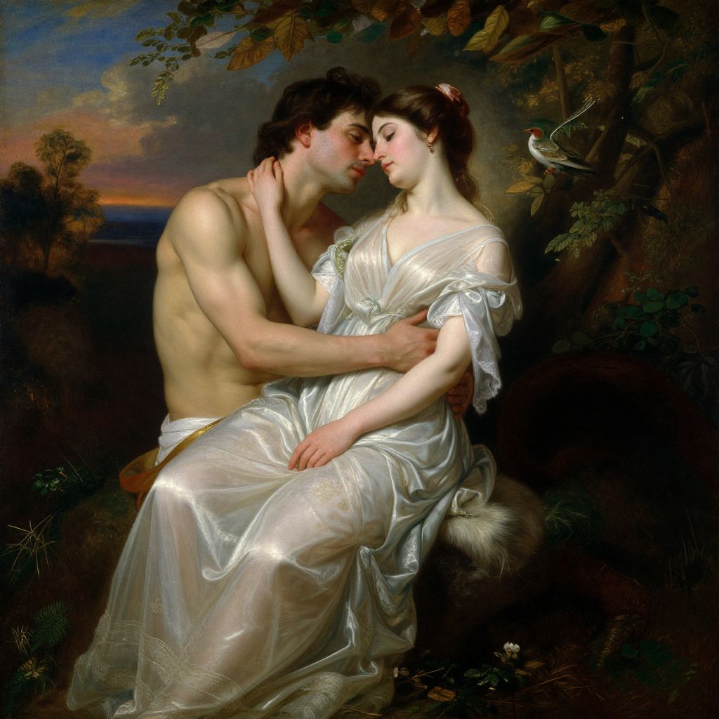 A romantic Neoclassical-style oil painting depicts a muscular, shirtless male figure tenderly embracing a woman in an elegant gown, set against a lush, pastoral backdrop with dramatic lighting reminiscent of 19th-century Symbolist art.