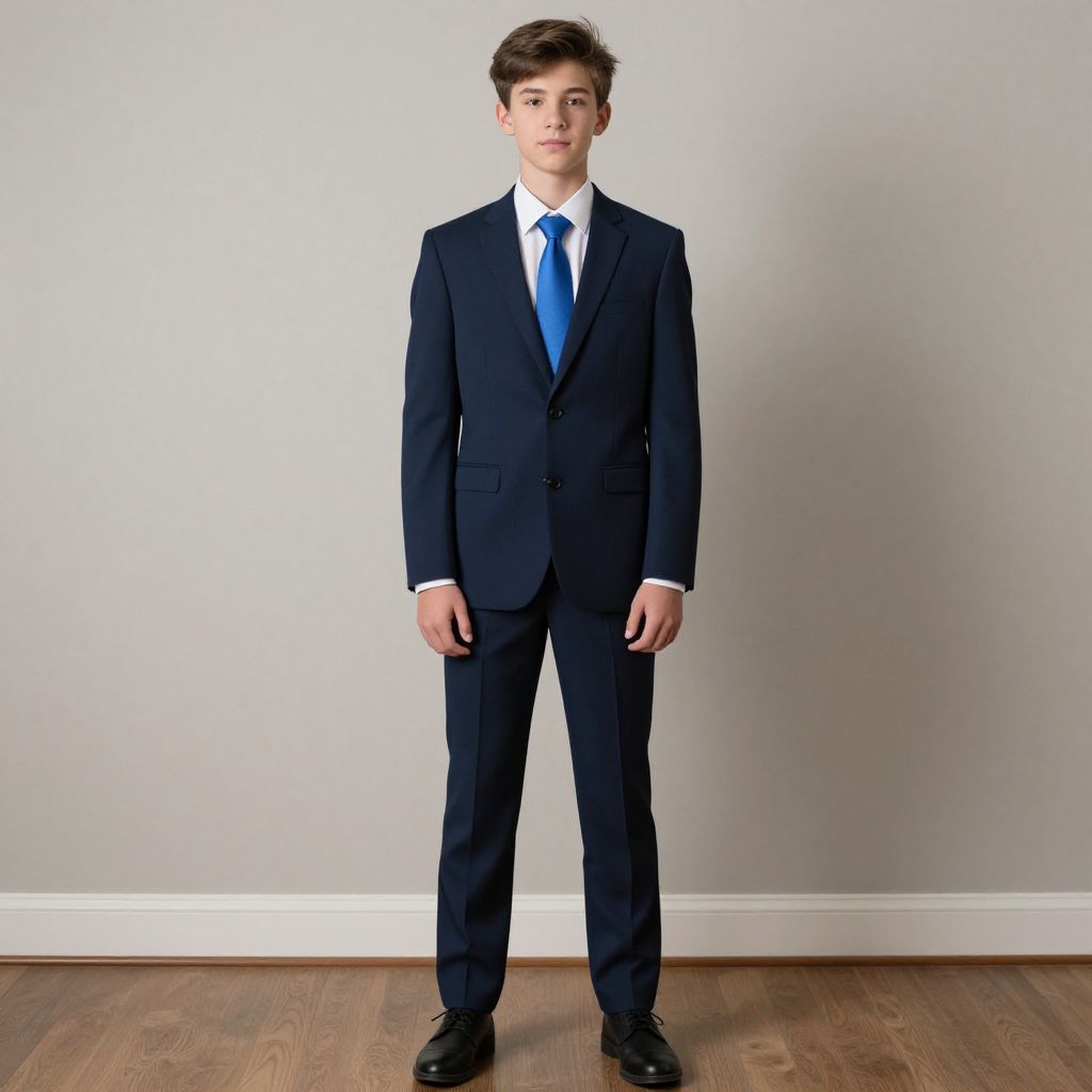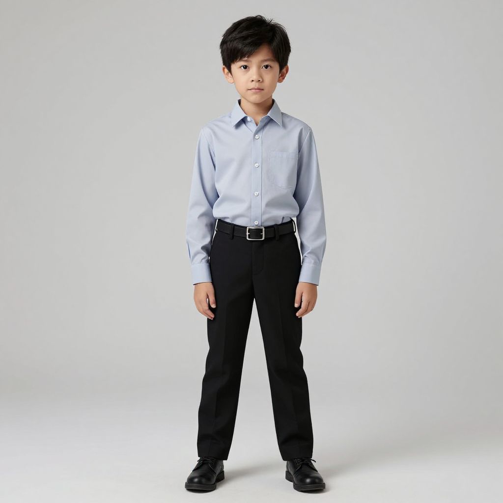 Boy with blonde hair wearing a blue shirt and jeans with a brown belt.