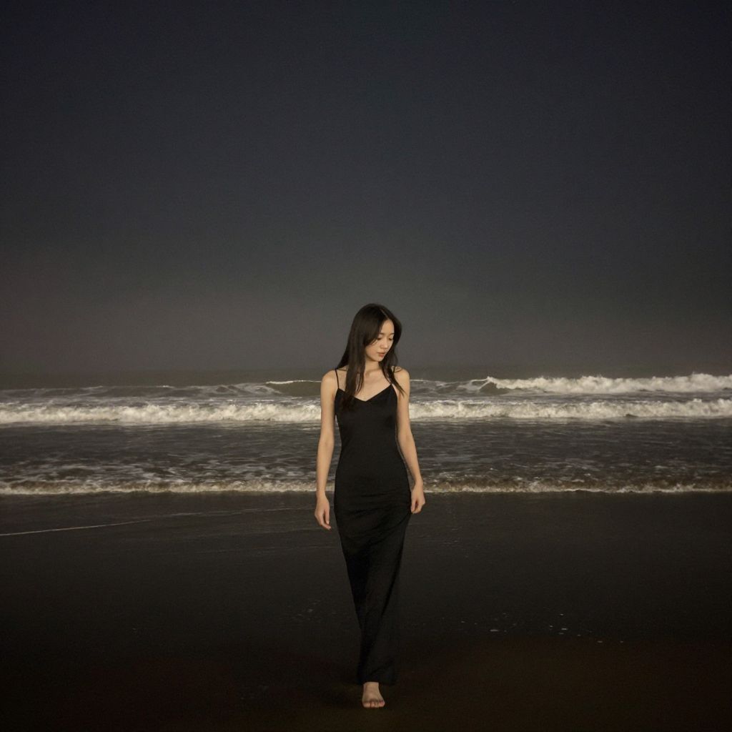 A photograph of a young woman with straight black hair, wearing a black sleeveless top and black pants, walking barefoot on a dark, wet beach at night. The ocean waves are visible in the background, illuminated by subtle moonlight, creating a contrast between the dark shore and the white foam of the waves. The sky is a deep, almost black purple, adding to the moody, serene atmosphere. The woman's expression is neutral, and she looks slightly downward as she walks.