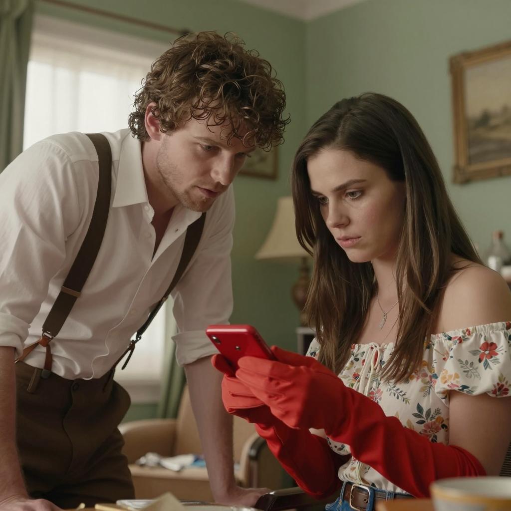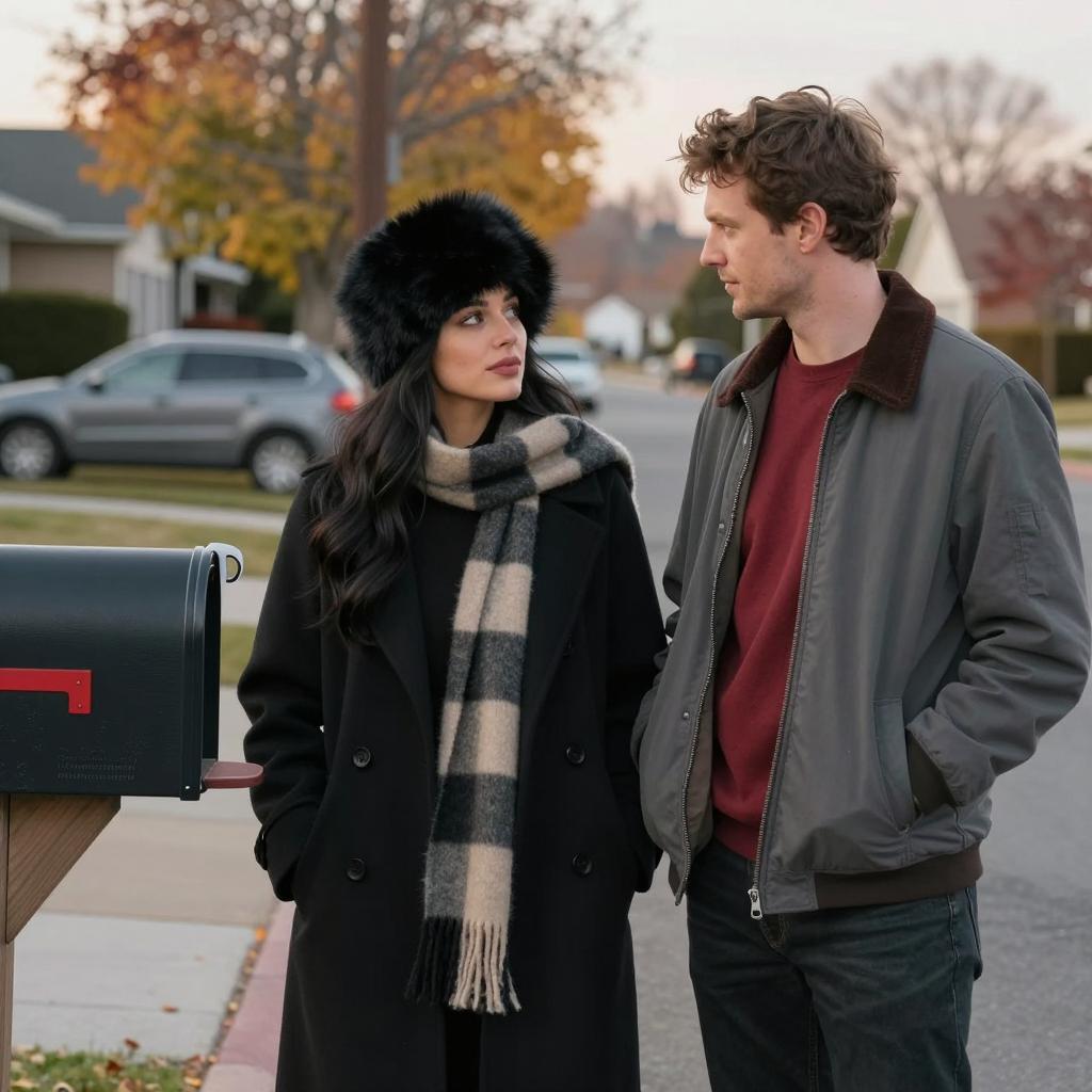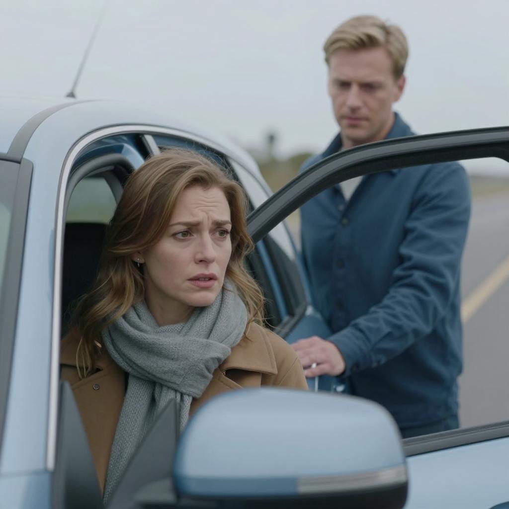 Man with blond hair, brown coat, and fur collar leans into car, talking to woman in gray knit hat and black coat. Woman holds phone to her ear. Man looks down, woman smiles slightly. Man stands left, woman right. Background: hills, trees, white house. Man in black suit and hat stands in background. Car in foreground.