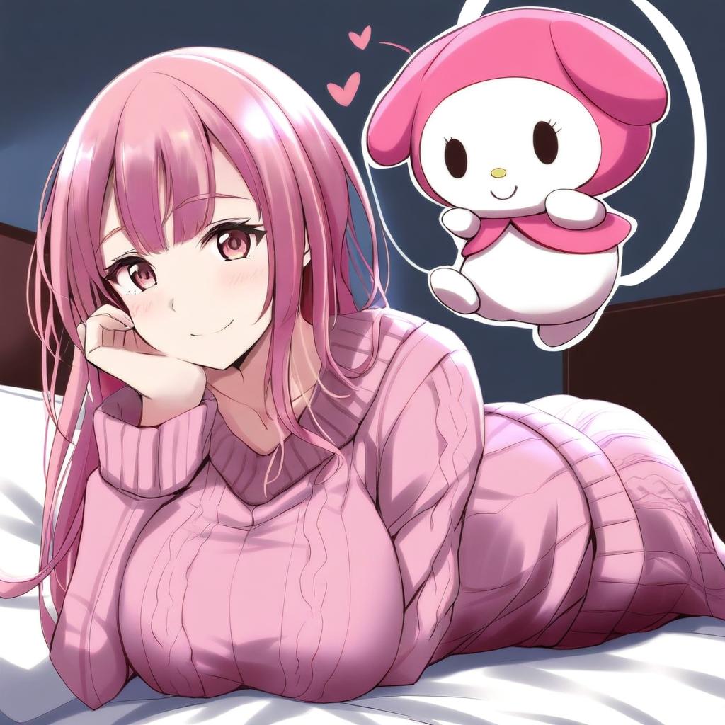 This digital anime-style illustration features a pink-haired girl with large breasts, lying on a bed wearing a pink, ribbed, long-sleeve sweater. She has fair skin, pink eyes, and a slight, relaxed smile, with her head resting on her right hand. Beside her, on the right, is a small, cute, white and pink character with a mushroom-like hat and a simple, smiling face, floating with two pink hearts above its head. The background is dark blue, contrasting with the bright white bed. The girl's hair is long and straight, with soft shading and highlights. The overall style is vibrant and playful.