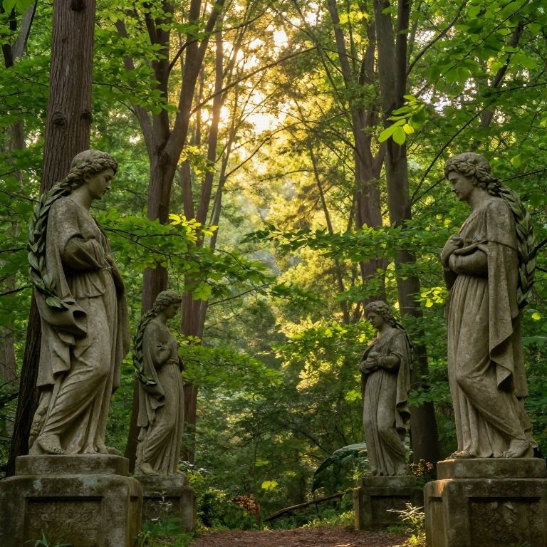 Photograph of a serene forest scene featuring three stone statues of classical-style female figures with long, wavy hair and flowing robes, standing on stone pedestals. The statues are positioned in a triangular formation, with two on the left and right and one in the center. The background is lush with tall, dense trees and bright green foliage, with sunlight filtering through the leaves, casting a warm, golden glow. The statues are weathered, with moss and age marks visible, enhancing their ancient, timeless appearance. The forest floor is covered with a mix of grass and fallen leaves.