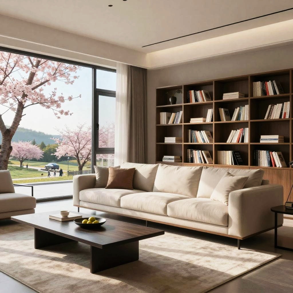 Photorealistic modern living room, sharp and crisp background, (sofa:0.8), low table, (bookshelf:0.7), cherry blossoms from window, very beautiful landscape, best quality, masterpiece, ultra high res, in the morning light, detailed lighting, blue sky, (((photo))), (((photorealistic))), kkw-ph1, wide shot
