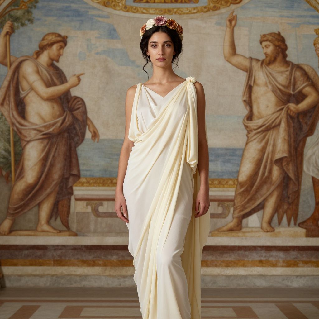 Elegant woman draped in a flowing cream toga adorned with floral headpiece stands gracefully against a backdrop of classical frescoes featuring mythological figures.