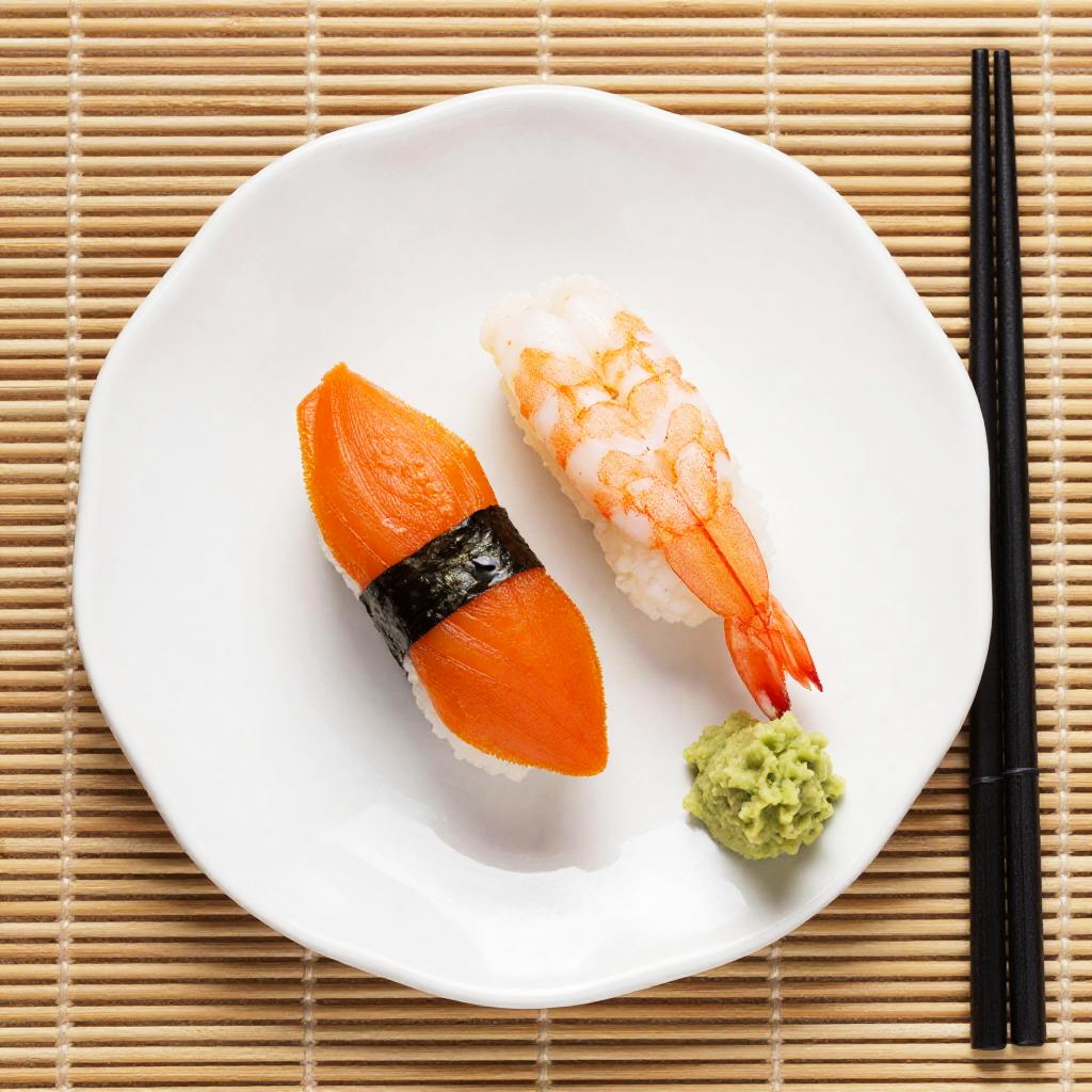 A top-down photo of a white, irregularly-shaped plate with three pieces of sushi: a bright orange piece topped with black seaweed, a pink shrimp piece, and a small green mound of wasabi. The plate is on a bamboo mat with black chopsticks to the right. The colors are vivid and the textures are clearly defined.