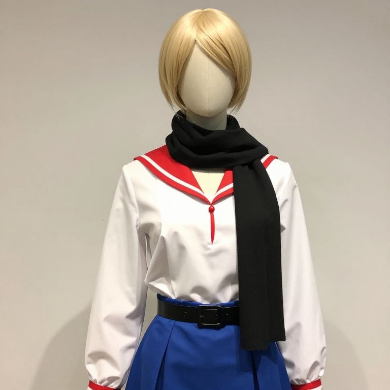 Mannequin with blonde hair and a black scarf around his neck. He is wearing a white shirt with red accents and a blue skirt with a black belt.