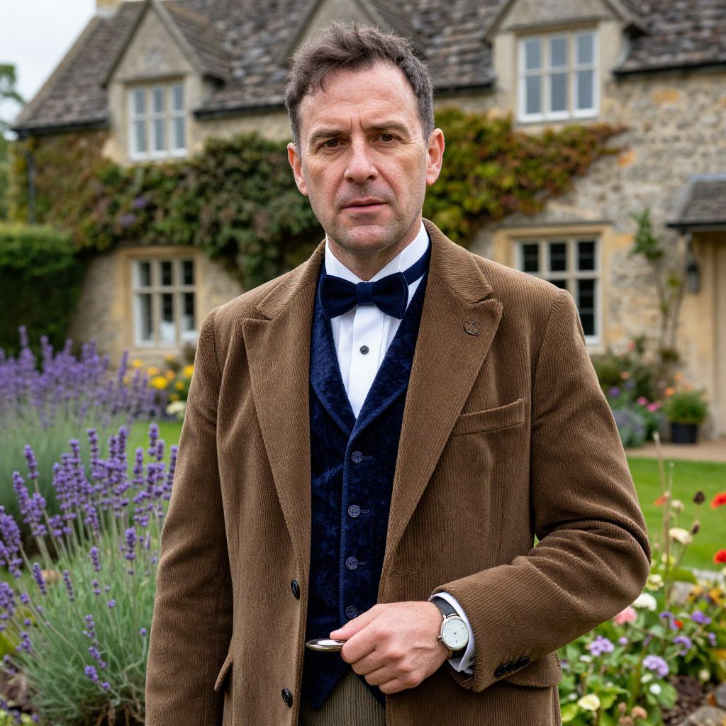 A naturally lit portrait of a man in his 40s with a weathered face, short dark hair, and deep brown eyes dressed in stylish British garden party costume — a tailored corduroy suit with a velvet waistcoat, bow tie, and a pocket watch, standing in front of a grand stone cottage with ivy-covered walls and a garden full of lavender and wildflowers.