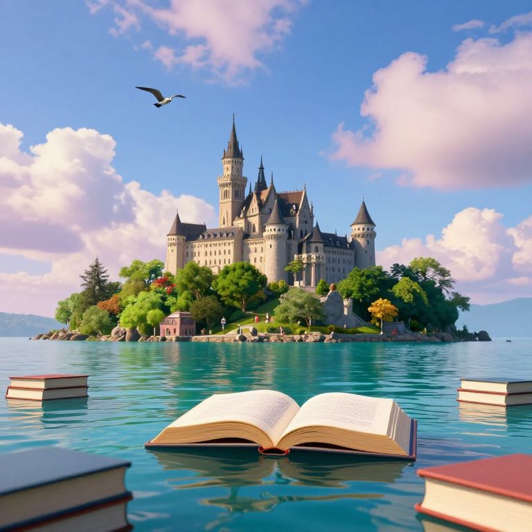 Books float serenely on turquoise waters, encircling a majestic castle perched atop a lush island, as a lone bird soars against a vibrant sky dotted with fluffy clouds.