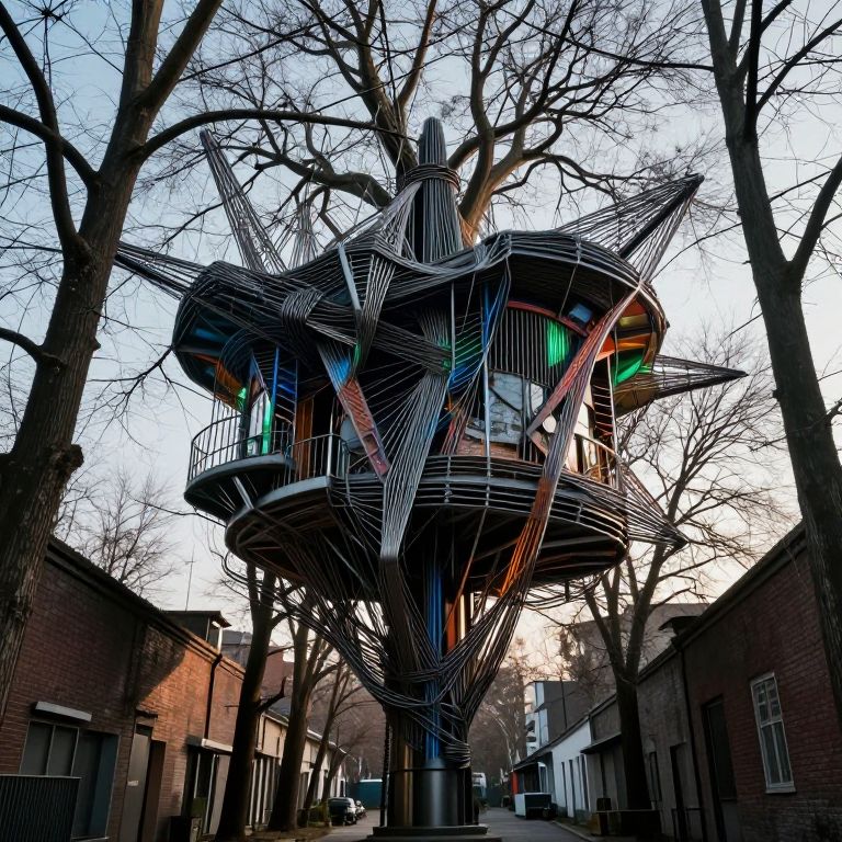 Photograph of a modern, multi-tiered treehouse with a geometric, lattice-like design. The structure is elevated among tall, leafless trees, with colorful, slanted panels on each level. It features circular balconies with glass railings and is surrounded by brick buildings with large windows. The sky is clear, and the lighting suggests early morning or late afternoon. The treehouse's intricate metal framework creates a striking, futuristic contrast against the natural, urban background.