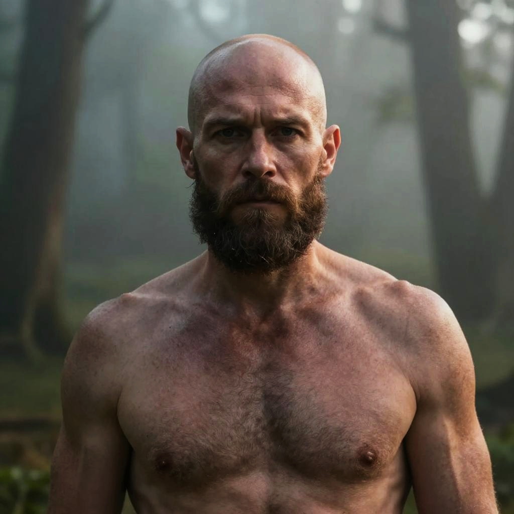 Glatze mit Bart, muscular man wearing a leather jacket, bald head shining under street lights, thick dark beard, grungy industrial background, rain-soaked streets, realistic and gritty urban portrait