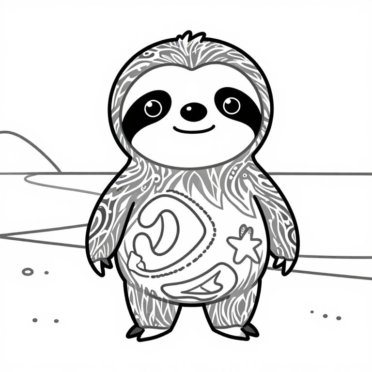Batik baby sloth character, no color, no shading, kids coloring book style, white background, at the beach,