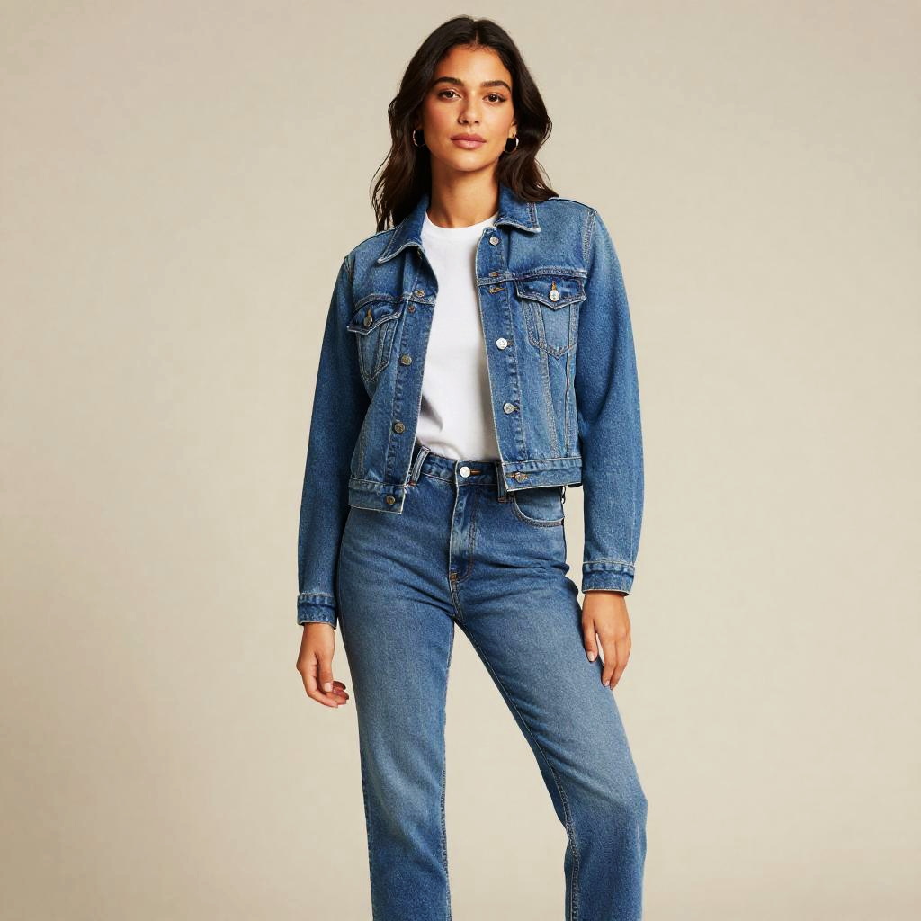 A confident young woman poses against a white background wearing a stylish blue denim jacket and matching denim skirt. Her long, wavy blonde hair and fashionable black crop top complemented by layered gold necklaces give the portrait a trendy and modern look.