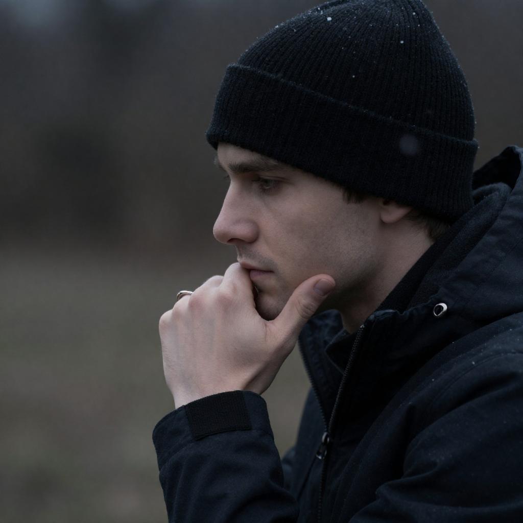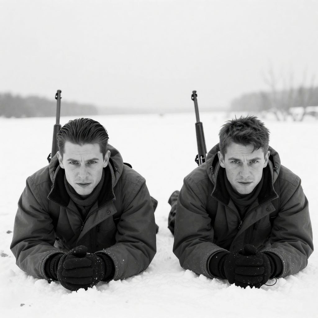 Photograph of two men in cold weather gear. Front man, light-skinned, black beanie, green jacket with patches, serious expression, looking right. Back man, light-skinned, fur hat, green jacket, partially obscured, calm expression, looking down. Overcast sky background.