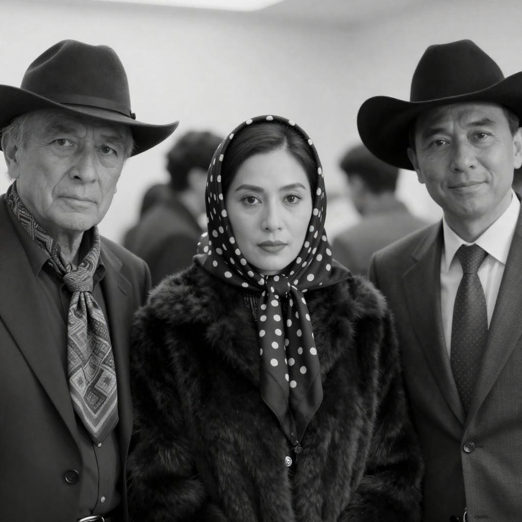 Photograph of three people sitting together in a theater. An elderly woman on the left wearing a dark dress, purple hat, and glasses. In the center, a young boy dressed in a blue outfit with a white collar and green hat. On the right, an older man in a brown suit, white shirt, and blue tie. The background shows an audience seated in rows, many wearing various hats, all attentively looking forward.