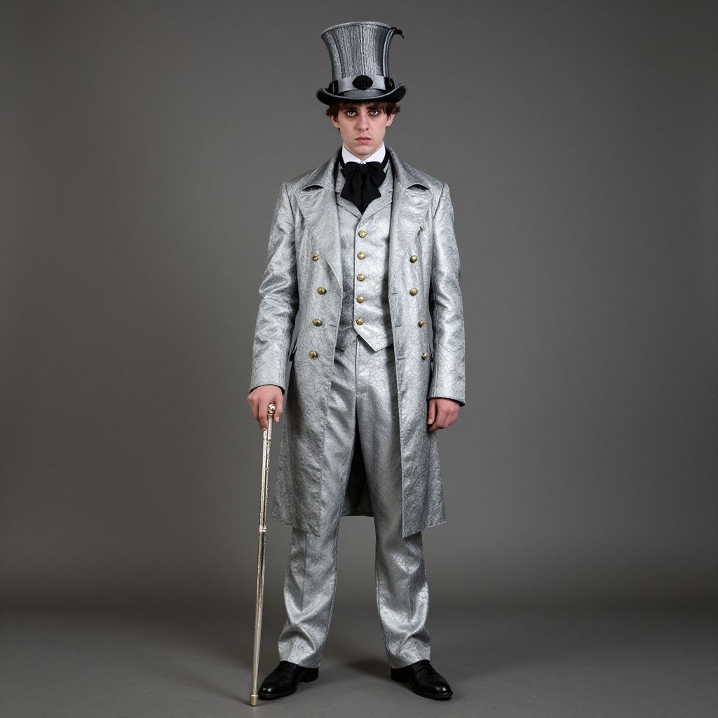 Photograph of a person standing against a plain gray background. They are wearing a shiny, metallic silver top hat, matching silver double-breasted coat with large buttons, and silver trousers. The coat is long, reaching down to the knees, and the trousers are slightly baggy. They have black shoes and are holding a silver cane in their right hand. The person has pale skin, dark eyebrows, and short dark hair. The overall style is reminiscent of a Victorian-era magician or performer. The metallic texture of the clothing reflects light, adding a dramatic effect to the image.