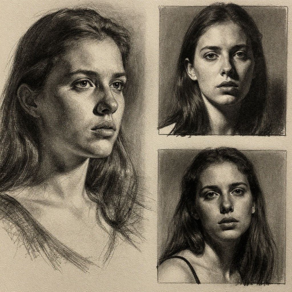 A black and white pencil drawing triptych of a young woman with long, straight hair and a serious expression. The left image is a detailed close-up of her face, showing delicate facial features and subtle shading. The two smaller images on the right provide different angles, one slightly above eye level and the other at eye level, highlighting her intense gaze and natural beauty. She wears a simple, sleeveless top. The background is a textured, off-white paper, adding a vintage, sketch-like feel to the artwork.