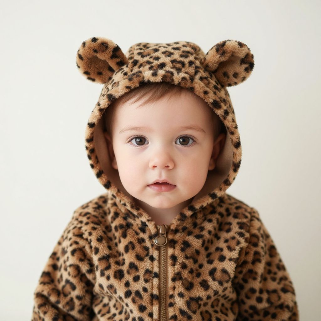 Photograph of a fair-skinned baby with blue eyes, wearing an orange knit bear-eared hat and matching orange puffy jacket, set against a