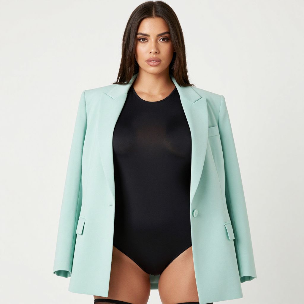 "Woman, contemporary chic, mint green blazer with notched lapels and single button closure, worn over a black bodysuit, form-fitting, round neckline, sleeveless, thigh-length, plain white studio background.. Sexy. Pretty face and beаutiful eyes. Big breasts."