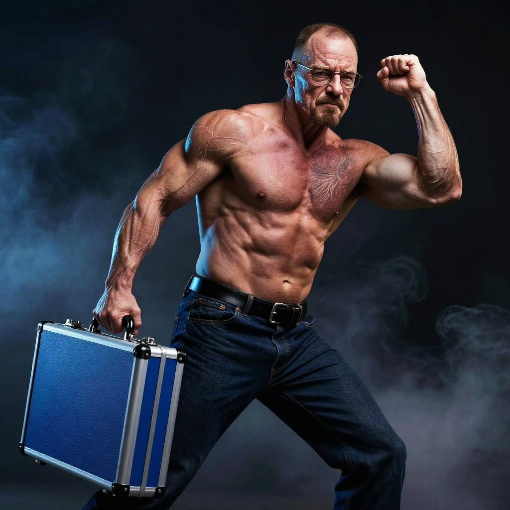 Buff Walter White in a dynamic action pose, holding a briefcase of blue meth, veins and muscles defined, with a smoky, dark background and neon blue highlights, capturing a blend of chemistry and raw physical power.