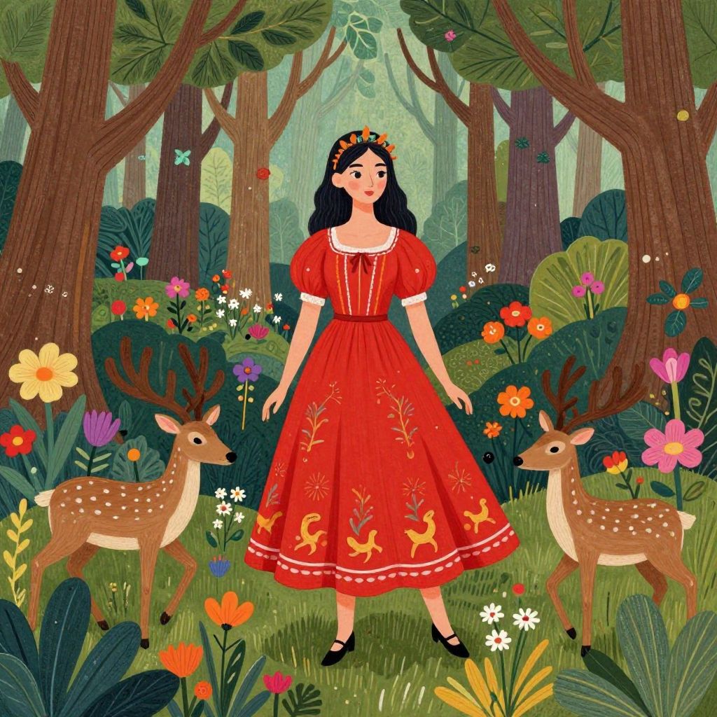 A vibrant and colorful illustration featuring a woman in a striking red dress standing amidst a lush, fantastical forest. The artwork showcases an enchanting natural setting, filled with vibrant flowers and playful deer, reflecting a magical and whimsical atmosphere. This piece exhibits a rich palette and intricate details, characteristic of folk art styles.
