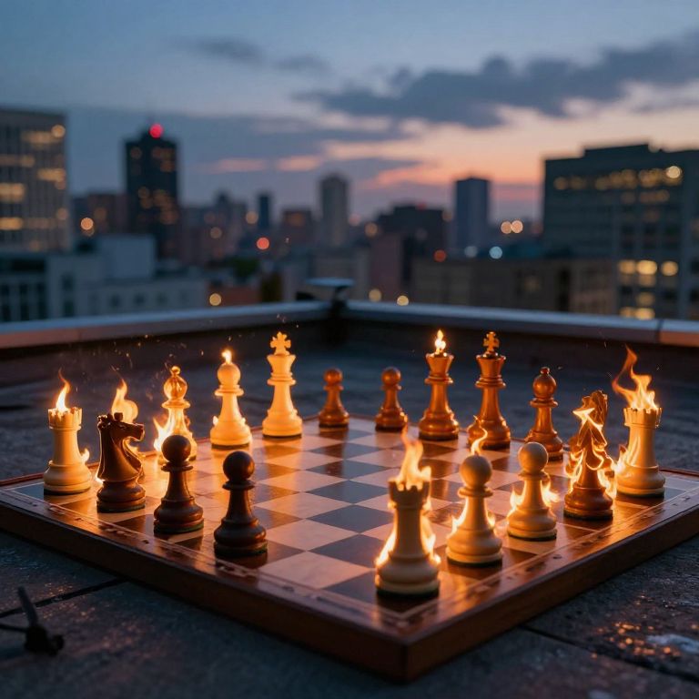 Fiery chess pieces ignite dramatically on a rooftop chessboard, casting dynamic shadows against a twilight cityscape backdrop.