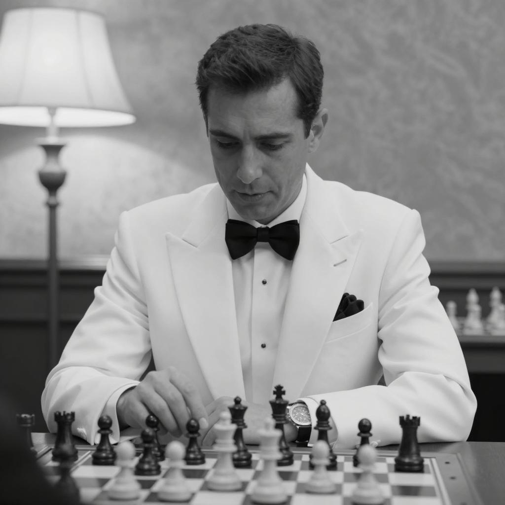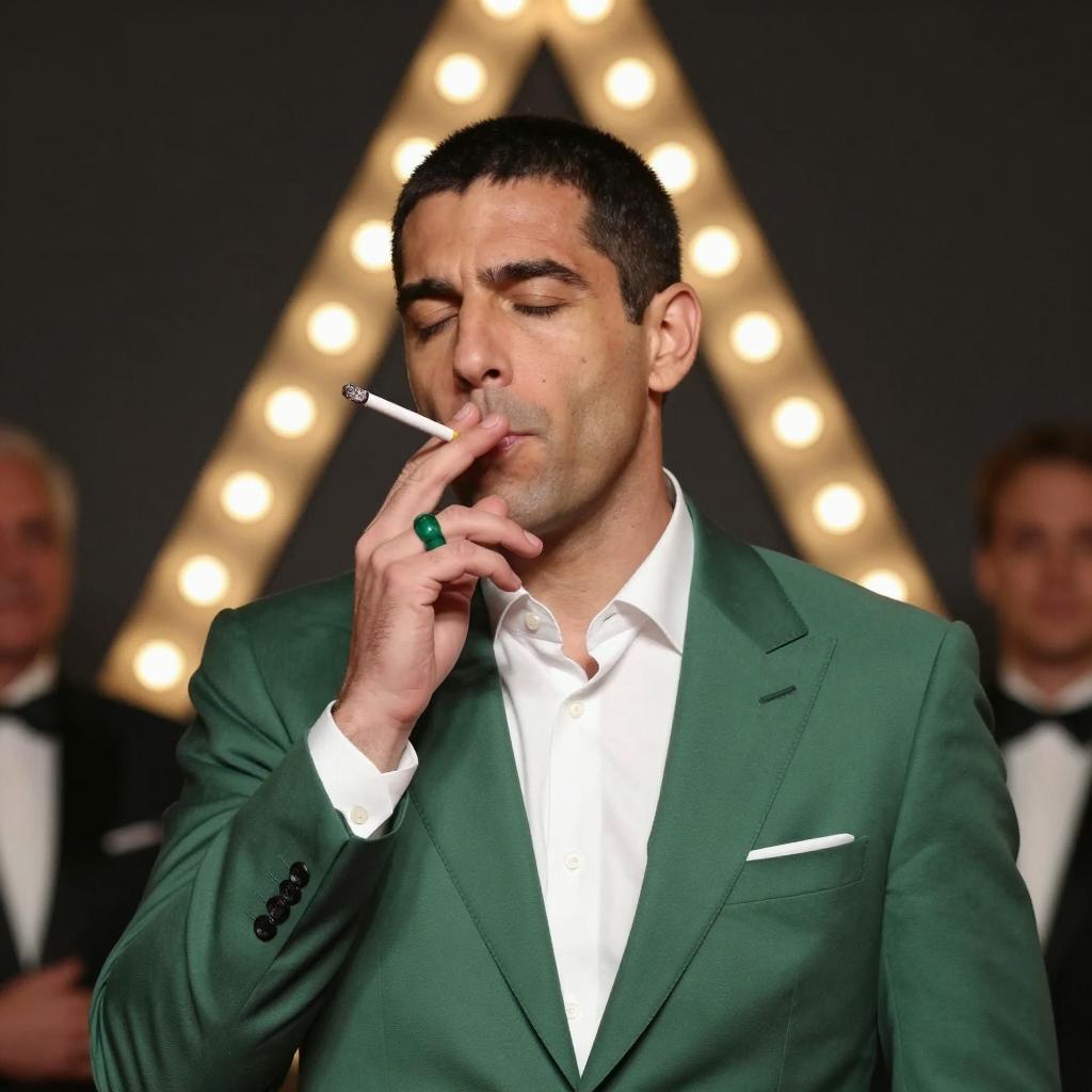 Man with short dark hair and clean-shaven face wearing a green suit jacket with a white shirt and pocket square. He is holding a cigarette close to his mouth with eyes closed, wearing a green ring on his hand. Background features a triangular array of warm illuminated lights and blurred figures in black tuxedos.
